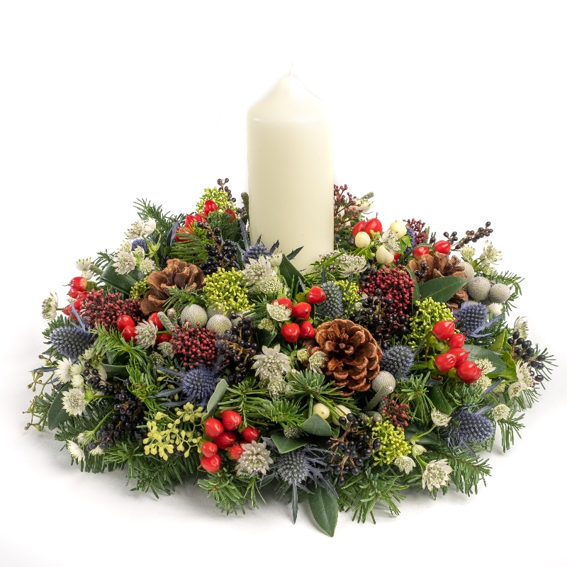 A lovely mix of natural materials including, astantia, thistles, skimmia,spruce and mixed festives greens.