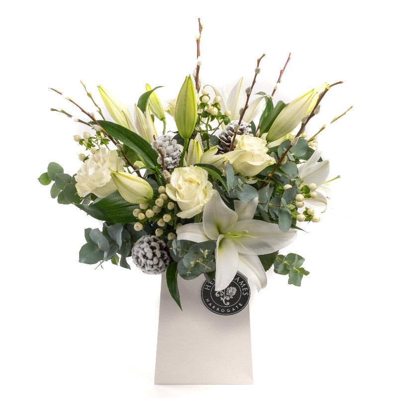 A classic Hand Tied of Roses, Lilies, Berries and Pussy Willow with Eucalyptus Foliage and Snowy Pine Cones.
